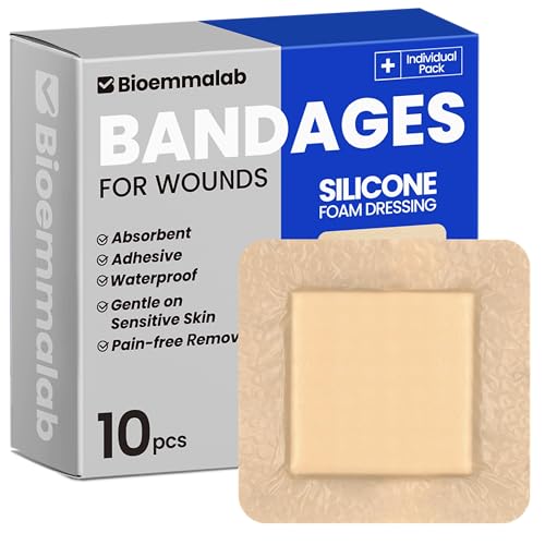 0% off Large Waterproof Bandages 4x4 Silicone Foam Dressing for Sensitive Skin Wound Care, Adhesive Cohesive Pad with Border for First Aid, 10 PCS, Post Surgical and Trauma Care, Burn 0% off