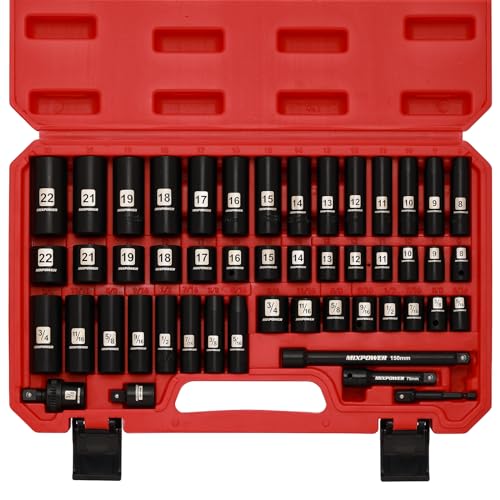 0% off MIXPOWER 3/8" Drive Deep Impact Socket Set, 6 Point, 49 Piece Standard SAE and Metric Sizes-5/16-Inch to 3/4-Inch and 8-22 mm, 3/8'' impact universal joint, Cr-V Steel Mechanic Socket Set 0% off